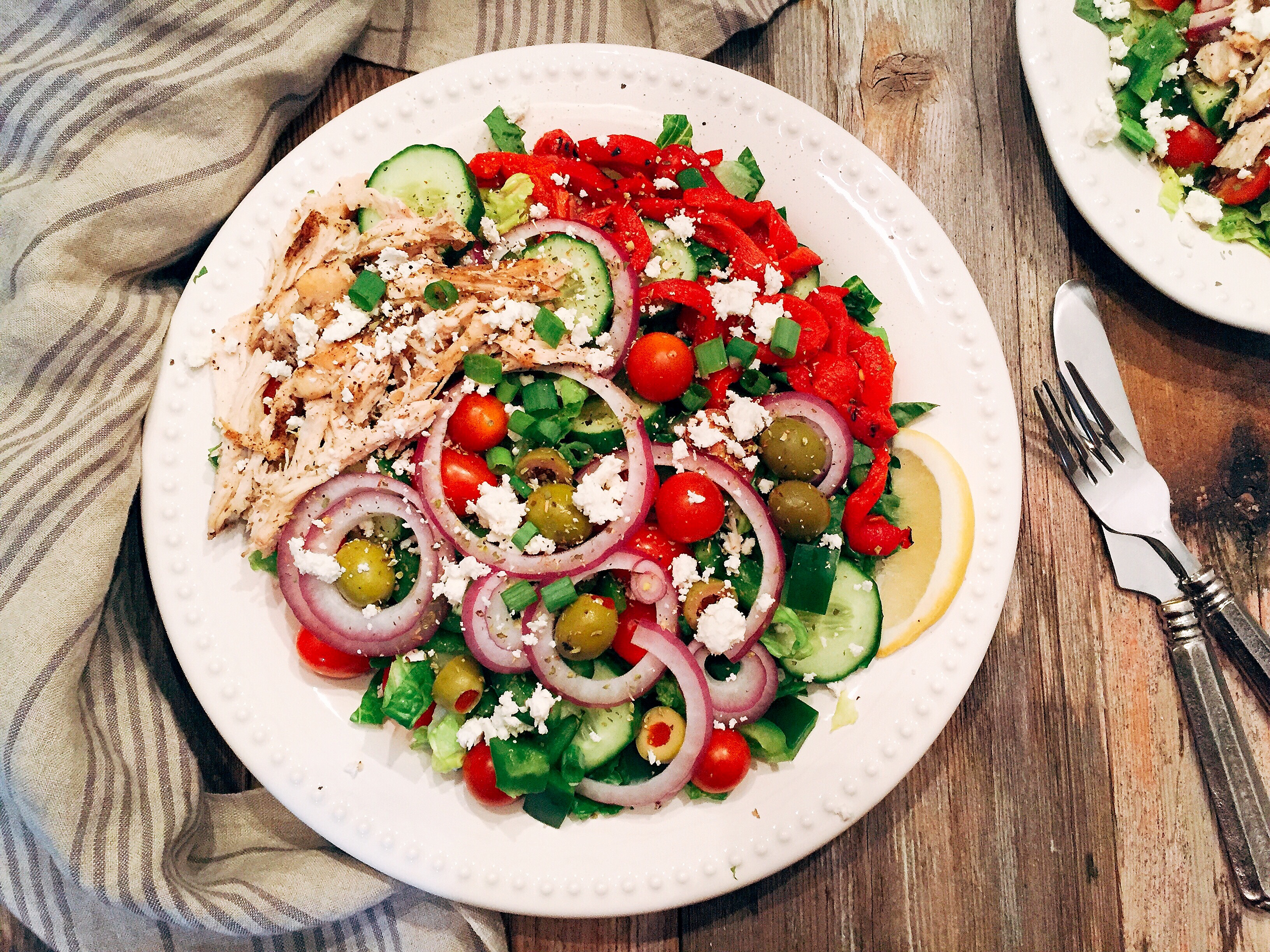 Mediterranean Chicken SaladGrilled chicken, mixed greens, artichoke hearts, roasted red peppers, red onions, cucumbers, tomatoes, feta, & croutons with lemon-balsamic dressingFull $20.49 | Petite $15.99